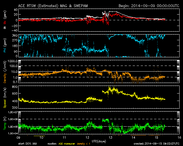 On 11 September at 23:02UT, ACE observed a shock in the solar wind indicating the arrival of the CME related to the M4 flare. Solar wind speed increased from about 350 to 480 km/s, with Bz oscillating between -14 and +11nT. The impact resulted in active geomagnetic conditions (Dourbes), while Kp reached minor geomagnetic storm levels.