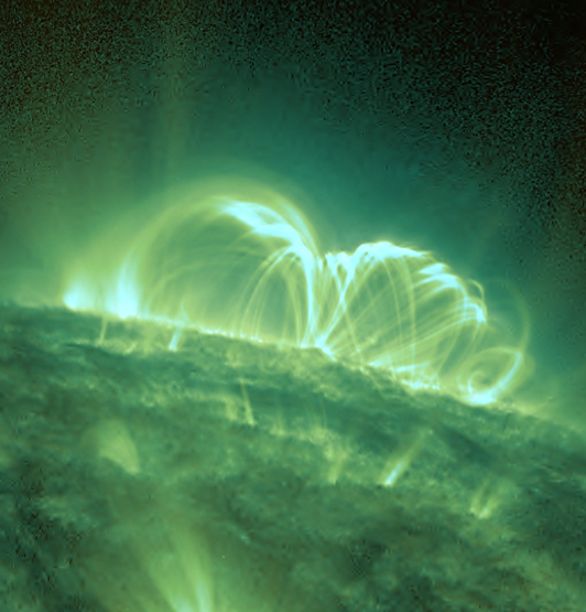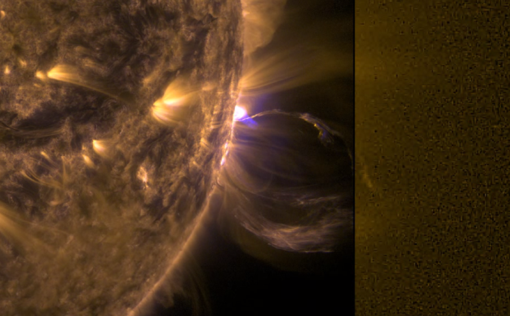 It is followed by a multi-temperature view from SDO (AIA 171 in yellow, AIA 131 in blue) overlaid on the wide field-of-view from the PROBA2/SWAP camera. This gives a view of the event in hotter temperatures around 1 million degrees. There's also a zoom on the complex arcade, i.e. a complex series of post-eruption coronal loops (see images above). The movie concludes with a clip of the CME as seen by SOHO's coronagraphs.