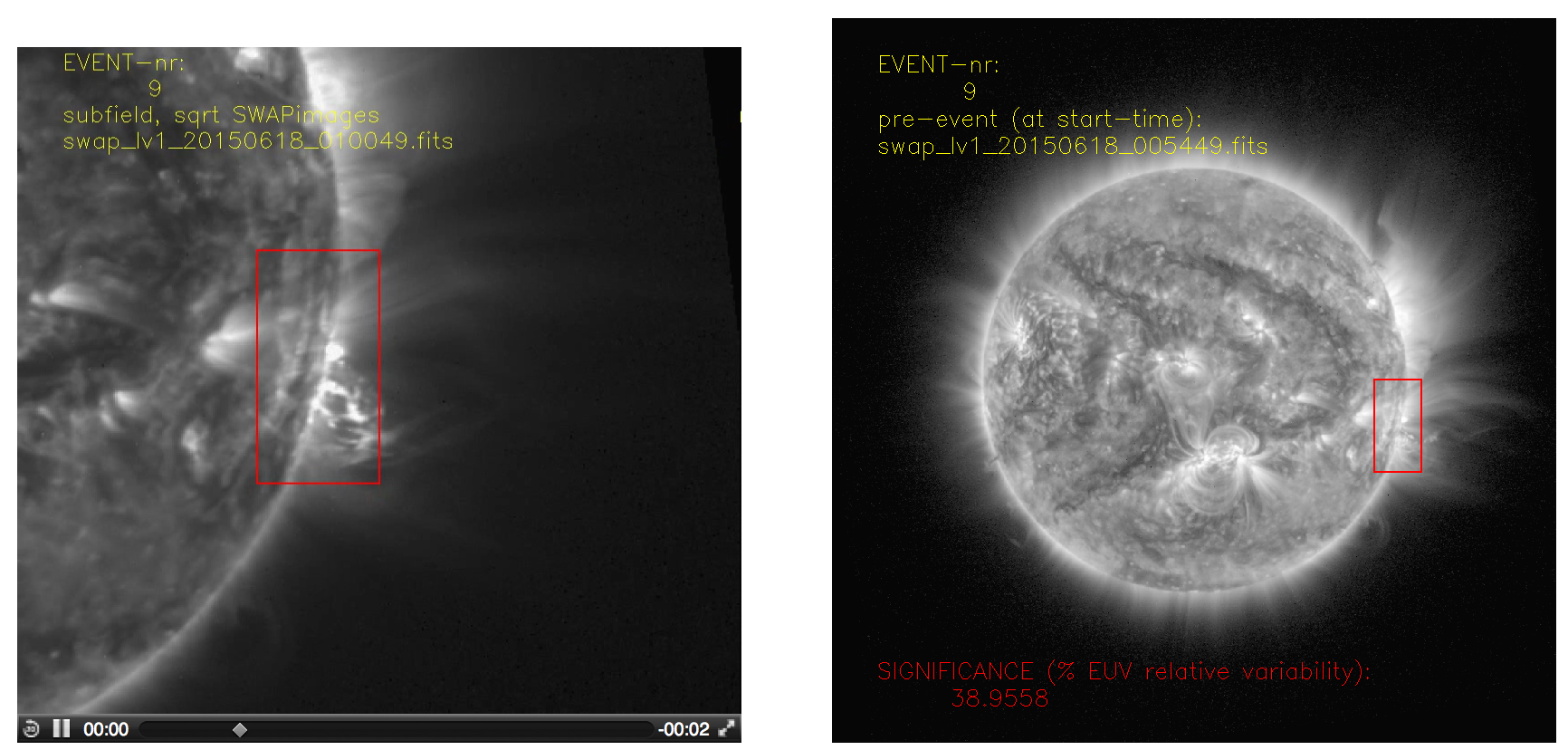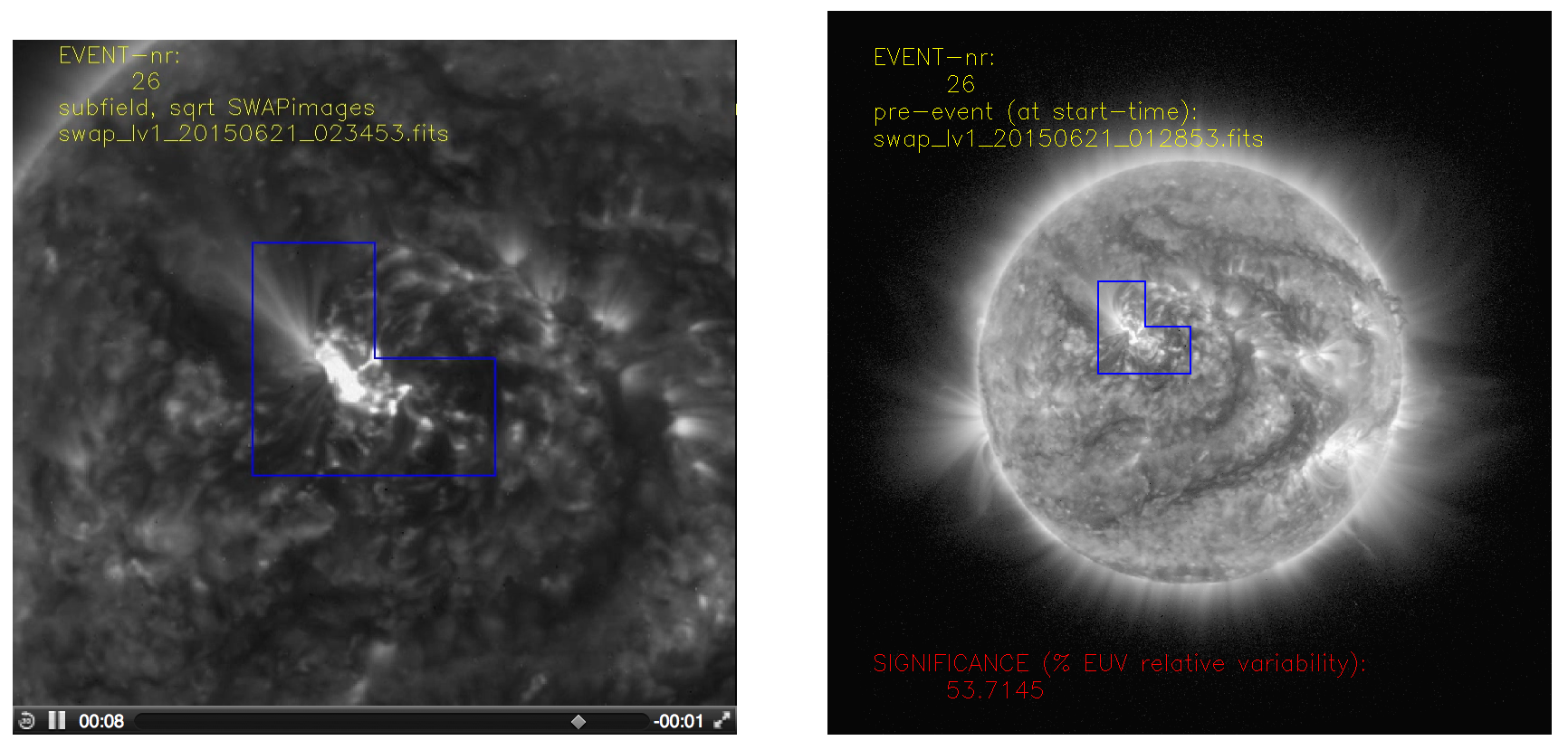 Below we provide SWAP images of each of the M-flares. These annotated snapshots are produced by the Solar Feature Automated Search Tool (SoFAST). This tool detects dynamic solar events in EUV images from SWAP in near real-time. More info on SoFAST can be found here: http://www.sidc.be/sofast. We also include an irradiance figure of the double flare event produced on June 21st. The curve was produced by LYRA data, which can also be found on the above mentioned ssa website.