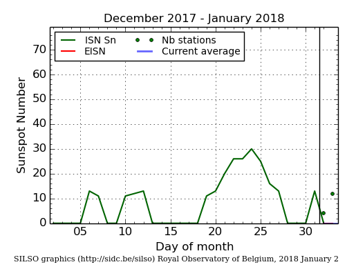 The daily Estimated International Sunspot Number (EISN, red curve with shaded error) derived by a simplified method from real-time data from the worldwide SILSO network. It extends the official Sunspot Number from the full processing of the preceding month (green line). The plot shows the last 30 days (about one solar rotation). The horizontal blue line shows the current monthly average, while the green dots give the number of stations included in the calculation of the EISN for each day.