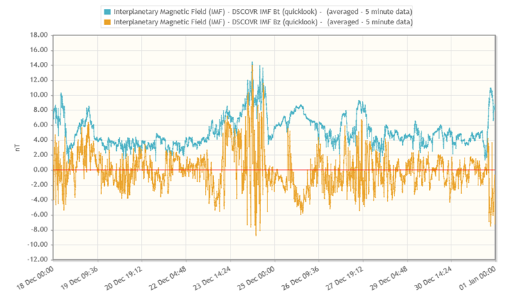 At the start of the period, the earth environment was under the influence of a high speed stream (HSS) from a positive polarity equatorial coronal hole (CH). Solar wind speed reached a peak of around 650 km/s and started to decline from the afternoon of 18 December onwards. By late on 22 December, the solar wind speed had dropped to 320 km/s, but then gradually started a new increase due to the influence of a HSS from the low latitude extension of the southern polar CH (negative polarity). Values around 550 km/s were reached late on 24 December, with Bz oscillating between -9 and + 13 nT.