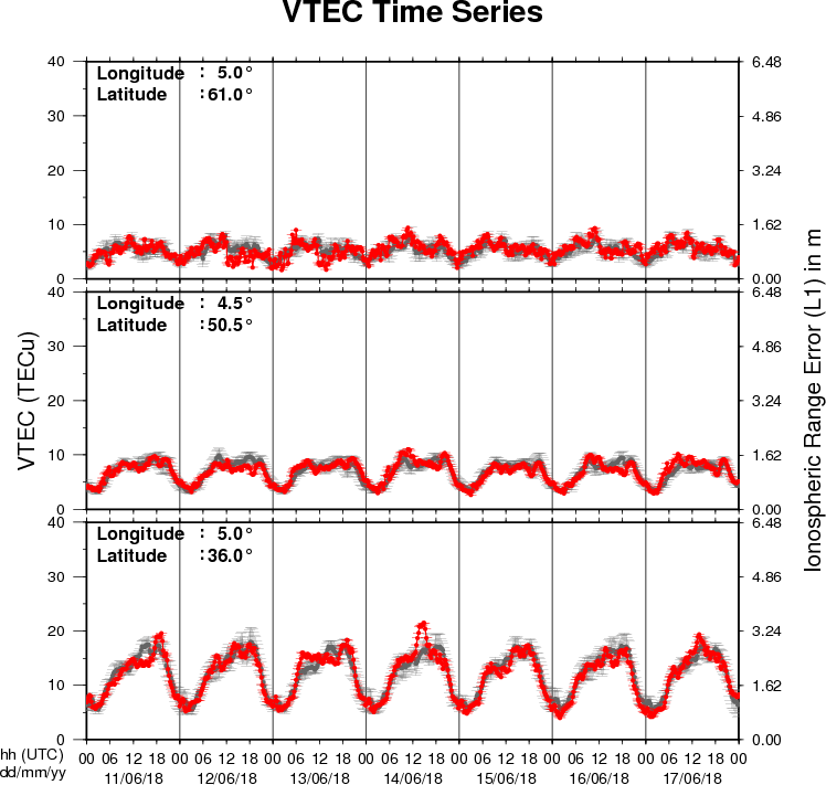 The figure shows the time evolution of the Vertical Total Electron Content (VTEC) (in red) during the last week at three locations: