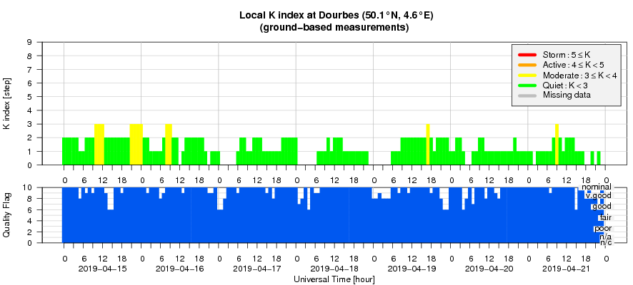 Quiet to unsettled geomagnetic conditions were observed throughout the week (Kp and K Dourbes), with most of the unsettled intervals occurring on 15 and 16 April.