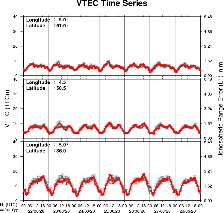 The figure shows the time evolution of the Vertical Total Electron Content (VTEC) (in red) during the last week at three locations: