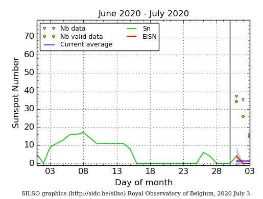 The daily Estimated International Sunspot Number (EISN, red curve with shaded error) derived by a simplified method from real-time data from the worldwide SILSO network. It extends the official Sunspot Number from the full processing of the preceding month (green line). The plot shows the last 30 days (about one solar rotation). The horizontal blue line shows the current monthly average. The yellow dots gives the number of stations that provided valid data. Valid data are used to calculate the EISN. The triangle gives the number of stations providing data. When a triangle and a yellow dot coincide, it means that all the data is used to calculate the EISN of that day.
