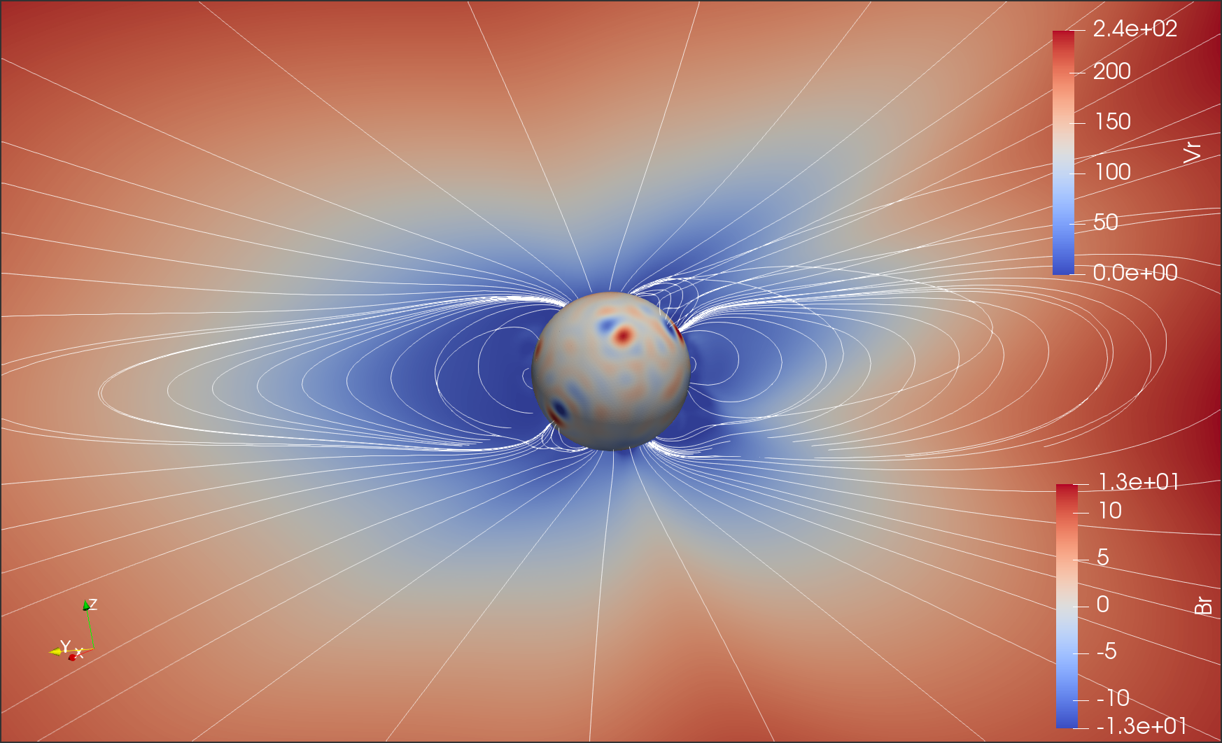 The background red/blue color represents the radial velocity of the wind in km/s with blue a slow wind and red a fast wind. If we link the color scale representing the speed with the white magnetic field lines, we see the so-called streamers: magnetic closed structures extending to several solar radii that are trapping the wind and producing slow wind patches (in blue). At the poles we have open magnetic field lines allowing the wind to accelerate and generate faster wind (in red).