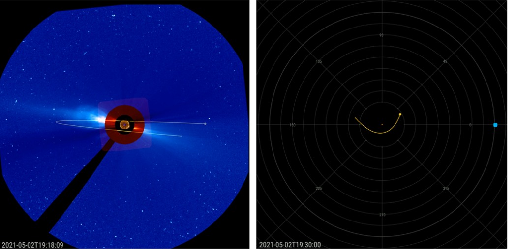 PSP was launched on 12 August 2018 from Cape Canaveral, Florida. Its main science goals are to trace the source(s) responsible for heating the corona to its multi-million degrees temperature, to find the acceleration mechanism for the solar wind, and to uncover the physical processes responsible for the accelaration and transport of the solar energetic particles. Through a series of well-calculated flybys of the planet Venus, PSP's orbit is getting altered such that the perihelions (i.e. the closest distance to the Sun during PSP's orbit around our star) are gradually lowered: from 24.8 million km during its first perihelion late 2018 to 11.1 million km in April 2021, and eventually to 6.9 million km from late 2024 onwards, which is less than 10 solar radii! Underneath graph shows the April 2021 perihelion as calculated by STCE scientists, with further descriptions in this STCE newsitem at https://www.stce.be/news/528/welcome.html It shows the trajectory from within the ecliptic as seen from Earth (left) and from above the ecliptic (right; PSP trajectory only, the blue dot on the right represents Earth). The ecliptic is the plane created by the yearly orbit of the Earth around the Sun.