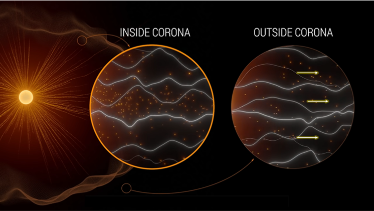 The difference in regime inside and outside the corona is shown in the annotated sketch above (screen shot from the NASA/GSFC movie). Outside the Alfvén critical surface, the solar wind particles are irreversibly gushing away from the Sun at high speeds (right circle), whereas inside this surface (in the corona ; middle circle), the Sun's magnetic field is much stronger, the particles are moving much more slowly and are more bound to the Sun. PSP also made an important discovery on the Alfvén critical surface itself. Indeed, during the flyby, Parker Solar Probe passed into and out of the corona several times. This confirmed an earlier prediction that the Alfvén critical surface isn't shaped like a smooth ball, but rather has spikes and valleys that wrinkle the surface (sketch above on the left). Discovering where these protrusions line up with solar activity coming from the surface can help scientists learn how events on the Sun affect its atmosphere and the solar wind.