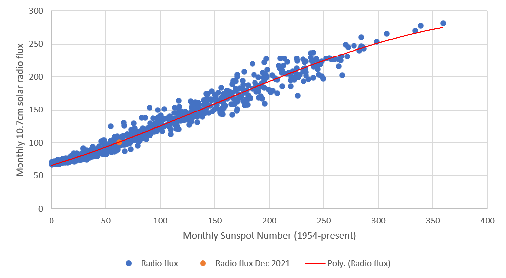 Quite a few of the visible sunspot groups were small and often barely visible, while the other groups had not very complex magnetic configurations. This was reflected in the flaring activity, with a relatively high number of C-class flares (10 or more every day), but only 5 low-level M-class flares (M1) during the entire period. Also the 10.7 cm solar radio flux (Penticton; https://www.spaceweather.gc.ca/index-en.php ) was at levels that could be expected for these sunspot numbers, occasionally enhanced by the radio noise generated by a solar flare taking place during or just before the recording period, such as on 18 and 21 December. The graph underneath shows the monthly values for the sunspot number versus the corresponding 10.7 cm radio flux since January 1954. The red curve, a 3rd-degree polynomial, gives a first idea of the relationship between these two parameters. Note it slightly underestimates the radio flux when the sunspot number is very low or very high, but as a first proxy it conveys the general evolution very well. The provisional (and incomplete) December 2021 pair of values (sunspot number, radio flux) nicely fits this curve, and also indicates that the current solar cycle still has a long way to go to its maximum (see the STCE's SC25 Tracking page at https://www.stce.be/content/sc25-tracking ), which is expected for August 2024 with smoothed values for the sunspot number and radio flux of 115 and 136 sfu (solar flux unit, 1 sfu = 10-22 W m-2 Hz-1) respectively.