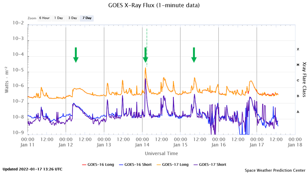 Last week saw again the presence of several sunspot regions which were relatively small and not very active. Meanwhile, from 12 January onwards, an active region behind the northeast solar limb manifested itself in extreme ultraviolet (EUV) imagery by producing several small flares. As the solar disk occulted most of the flaring area, this meant the flares must have been quite a bit stronger than the x-ray peak flux suggested. Underneath is a plot with last week's GOES x-ray flux (https://www.swpc.noaa.gov/products/goes-x-ray-flux ). The flares from the active region (NOAA 2932 as it eventually got numbered) which are further discussed in this news item are indicated with an arrow. The dashed line indicates the approximate timing when the region started to rotate over the solar limb, about 06UT on 14 January.