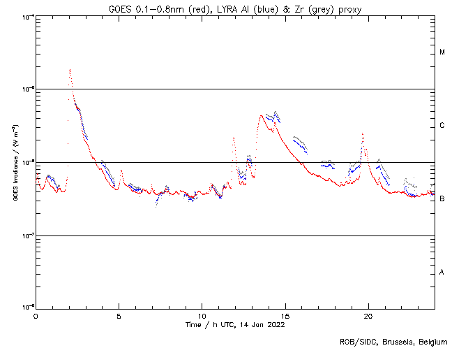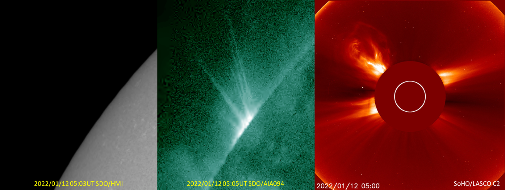 - Then there was the increase in the 10 MeV proton flux by STEREO-A's IMPACT instrument, starting early on 13 January and still in progress around 16 January (see the STEREO webpage at https://stereo-ssc.nascom.nasa.gov/browse/2022/01/15/insitu_7day.shtml). Though the enhancement is rather mild (a factor 10-20 above the nominal background flux), the spacecraft was not favorably connected to the source region as it was located at the Sun's east limb as seen from STEREO-A. So, enhancing the proton flux from that location is quite an accomplishment and testifies of a strong energetic event. Note that the partial halo coronal mass ejection (CME) associated with the eruption had a speed of at least 600 km/s, not so incredibly fast. However, analysis of the coronagraphic imagery seems to indicate that the main portion of the CME (to the northeast) moved considerably faster, most likely with speeds between 1000 and 1500 km/s (CACTus, https://wwwbis.sidc.be/cactus/).