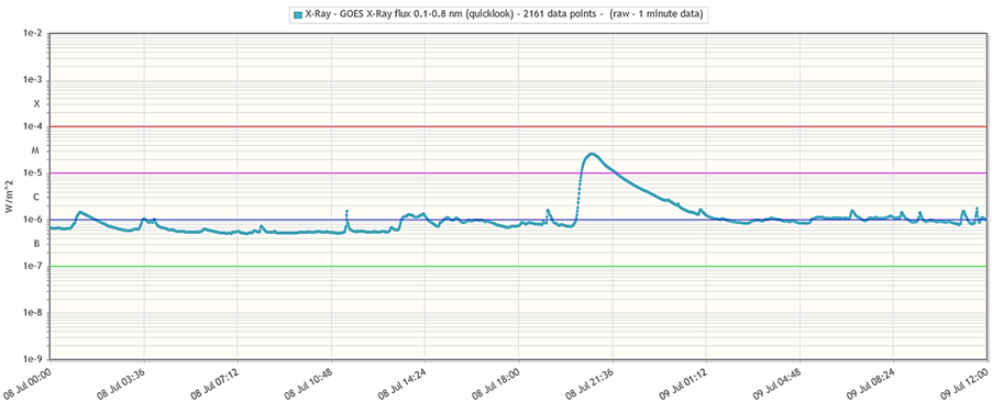 Solar flaring activity was low, except on 8 and 10 July when it reached moderate levels. An M2 from NOAA Active Region (AR) 3053 at 8 July 20:49 UT and an M1 from NOAA AR 3056 at 23:43 10 July, was measured. Among the C-class events, the most notable was a C8.5 emitted on 9 July 13:48 UT from NOAA plage region 3047.