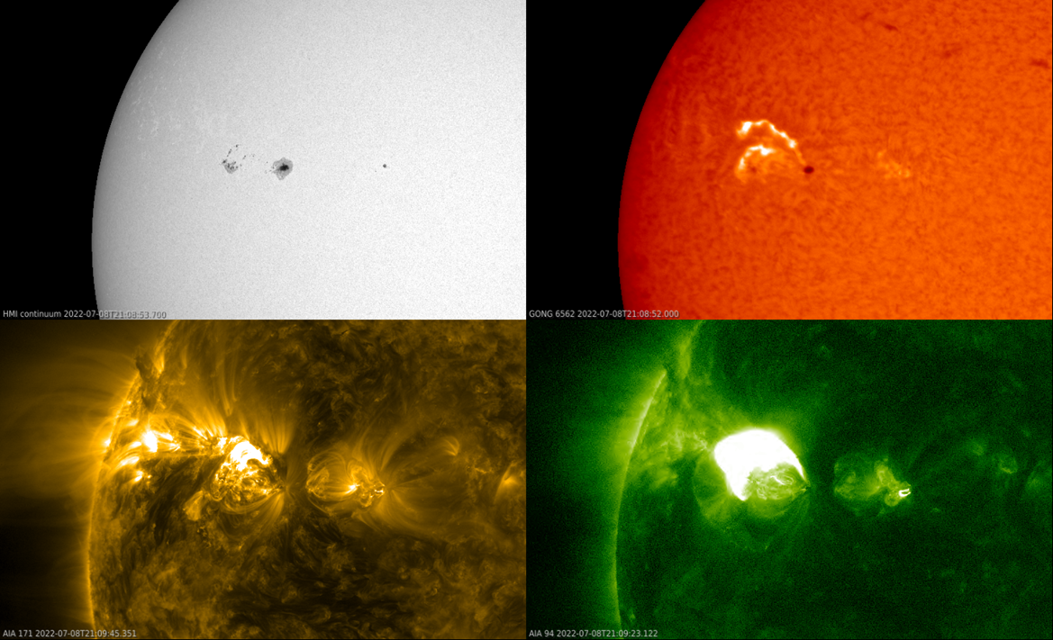 Using Space Weather HelioViewer (SWHV - http://swhv.oma.be/user_manual/), a mosaic was created showing the eruption at various wavelengths and running from 18:30 till 01:30UTC. This can be seen in the imagery underneath (taken around 21:09UTC), of which an animation is available in the online version of this article at https://www.stce.be/news/599/welcome.html In the upper left is a white light image (SDO/HMI - http://sdo.gsfc.nasa.gov/data/aiahmi/ ), showing the source region as a relatively open group with a well-sized asymmetric leading sunspot and a smaller but more complex trailing portion. This M2.5 solar flare was not visible in white light, an honor that is (usually) only reserved for the strongest flares. H-alpha images (upper right) show that the flare took place slightly north of this region around a filament. Solar filaments are clouds of charged particles ("plasma") above the solar surface squeezed between magnetic regions of opposite polarity. These magnetic fields may become unstable causing the filament to fully/partially erupt, with the possibility for the filament to reform after the eruption. H-alpha images show the Sun in the red portion of the visible spectrum near 656.3 nm, offering a glimpse of the chromosphere, a thin layer between the Sun's photosphere ("solar surface") and the corona, its hot outer atmosphere. Two parallel ribbons can be seen forming on each side where the filament was located, a tell-tale sign a flare has taken place. The H-alpha images were taken from the GONG network (https://gong.nso.edu/ ), a series of 6 similar observing stations distributed at regular intervals around the globe. This explains the somewhat "bumpy" images in the animation. The two lower images show the Sun in extreme ultraviolet and were taken by SDO/AIA. The lower left image was made using the AIA 171 filter, showing the Sun at a temperature near 700.000 degrees. It shows the development of the post-flare coronal loops, with the animation also showing the ejection of some material (CME). The lower right imagery is from the AIA 094 filter, showing the Sun at a temperature of several million degrees, and thus showing the hottest portions of the solar flare. Note the colors are not real but artificially added to distinguish between the various wavelengths.