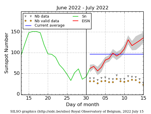 The daily Estimated International Sunspot Number (EISN, red curve with shaded error) derived by a simplified method from real-time data from the worldwide SILSO network. It extends the official Sunspot Number from the full processing of the preceding month (green line), a few days more than one solar rotation. The horizontal blue line shows the current monthly average. The yellow dots give the number of stations that provided valid data. Valid data are used to calculate the EISN. The triangle gives the number of stations providing data. When a triangle and a yellow dot coincide, it means that all the data is used to calculate the EISN of that day.
