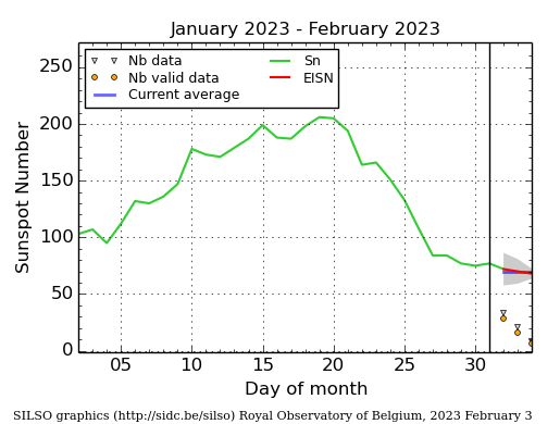 The daily Estimated International Sunspot Number (EISN, red curve with shaded error) derived by a simplified method from real-time data from the worldwide SILSO network. It extends the official Sunspot Number from the full processing of the preceding month (green line), a few days more than one solar rotation. The horizontal blue line shows the current monthly average. The yellow dots give the number of stations that provided valid data. Valid data are used to calculate the EISN. The triangle gives the number of stations providing data. When a triangle and a yellow dot coincide, it means that all the data is used to calculate the EISN of that day.