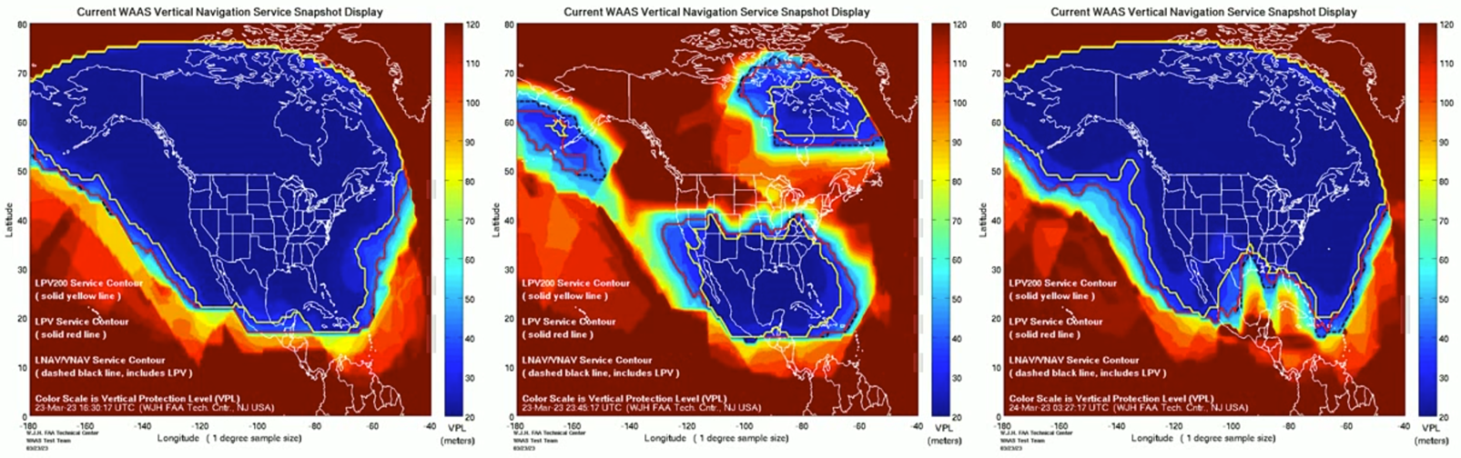 As a result of this severe geomagnetic storm, some GNSS-based applications for the civil aviation did not reach their typical availability, as can be gauged from the imagery underneath for the USA/Canada (WAAS - https://www.nstb.tc.faa.gov/index.htm ), covering the period 23 March (09:00 UTC) until 24 March (10:00 UTC). Blue colours mean good availability, red/brown means significantly degraded availability. Clearly the systems were underperforming while the geomagnetic storm was ongoing. In Europe, similar observations were made for the EGNOS system (https://egnos-user-support.essp-sas.eu/ ). Clips are available in the online version of this newsitem at https://www.stce.be/news/638/welcome.html
