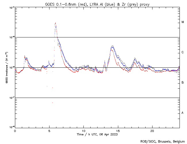 The largest flare of the week, an M3.0, was observed by LYRA (top panel) and SWAP (bottom panel). The flare occurred on 2023-Apr-06 (peak at 05:53 UT) at the south-eastern limb of the Sun, and it was associated with NOAA AR3272.