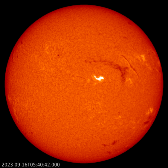 Early on 16 September a large filament near active region NOAA 3429 became unstable and erupted. The source of this instability might have been an M2 flare by NOAA 3429 that peaked at 00:50UTC. A stronger flare (M3) in the same sunspot region peaked a few hours later at 05:38UTC, but at that time, the filament eruption was already well going on. It is also possible that the magnetic fields holding the filament became unstable from their own as this concerned indeed quite a long filament. The eruption itself was not associated with an obvious x-ray flare. The H-alpha snapshot underneath was taken by the groundstations of the NSO/GONG network (https://gong.nso.edu/ ), showing the filament eruption in process around the time of the maximum of the M3 flare. Many decades ago, such events were also called "disparition brusque" (sudden disappearance), to highlight the suddenness of the filament's vanishing often after days or weeks with no appreciable change.