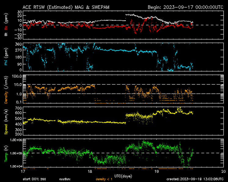 The solar wind conditions remained slightly elevated on Sept 13th and registered an expected high speed stream (HSS) arrival on Sept 14th with velocities reaching 520 km/s. The HSS influence was waning on Sept 15th and signatures of the next HSS arrival were disclosed in the solar wind data starting in the late UTC evening of Sept 16th. The interplanetary magnetic field was mildly enhanced to 11 nT with a minimum Bz of -8.7 nT. The solar wind velocity reached 500 km/s. The solar wind conditions remained at these mildly elevated levels throughout Sept 17th.