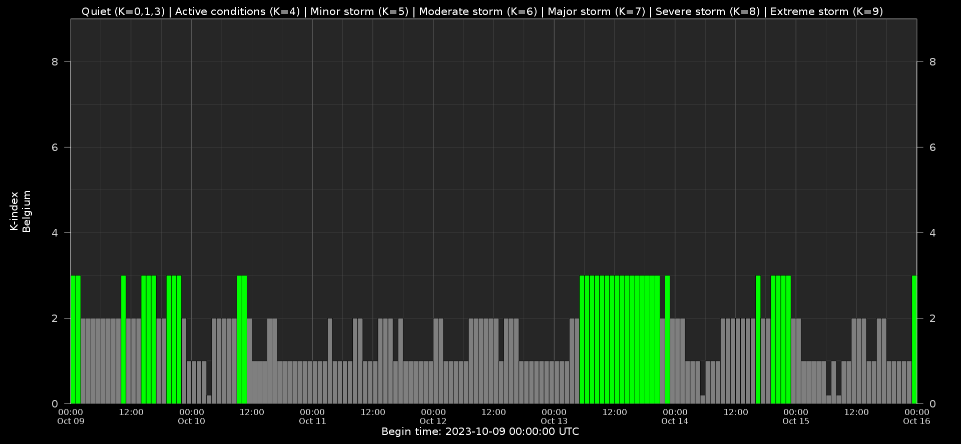 Geomagnetic conditions were quiet to unsettled both globally and locally (NOAA Kp 0+ to 3- and K BEL 0 to 3) until the arrival of a High Speed Stream (HSS) on October 13. However, the effects were minor and short-lived both globally and locally. NOAA Kp increased to active conditions (Kp 4-) only in the October 13, 15:00-18:00 UTC interval and locally K BEL remained up to 3. From October 14 onwards the geomagnetic conditions returned to quiet levels globally (NOAA Kp 0+ to 2) and stayed at quiet to unsettled levels locally (K BEL 0 to 3).