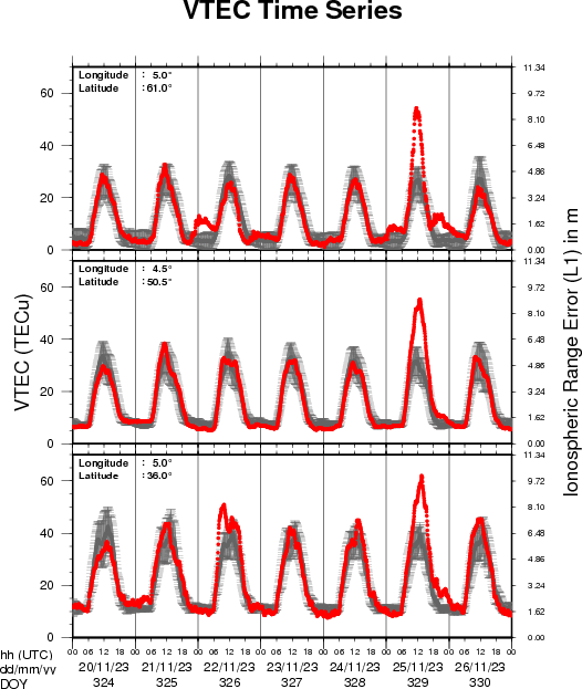 The top figure shows the time evolution of the Vertical Total Electron Content (VTEC) (in red) during the last week at three locations: