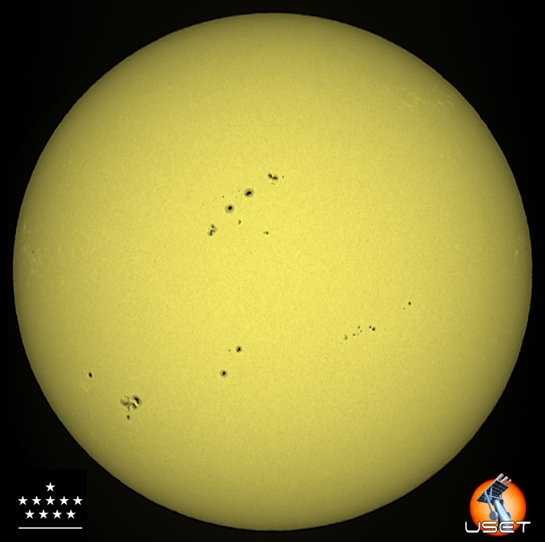 Starting on 18 November, a nest of sunspots started to round the Sun's northeast limb. It concerned a conglomerate of 5 sunspot groups cramped into an area of 15 by 20 degrees, as sardines in a can. This sunspot nest was then followed by a string of sunspot groups in the southern hemisphere nicely following one after the other. The white light image underneath was taken with the solar telescopes of the Royal Observatory of Belgium (ROB/USET - https://www.sidc.be/uset/ ) showing the solar disk on 23 November around noon.