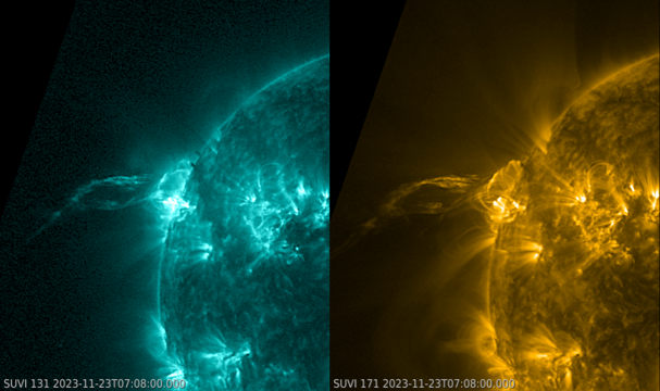 Despite all those sunspot groups, the flaring activity was limited to C-class flares and only 4 (four!) low-level M-class flares. The strongest one a was a long-duration M1.4 flare that peaked on 23 November at 03:38UTC. Its source was behind the northeast limb and as such not related to the sunspot nest that was already approaching the central meridian. The eruption apparently destabilized other areas on the Sun, resulting in the ejection (in two phases) of a filament at the northeast limb starting from around 05:30UTC onwards. A clip can be found in the online version of this newsitem currently at https://www.sidc.be/index.php It shows the Sun in multi-millions degrees (GOES/SUVI 131) on the left and at slightly "cooler" temperatures near 700.000 degrees (GOES/SUVI 171) on the right. The post-eruption coronal loops towered nearly 150.000 km above the solar limb, and the ejected filament material could be traced through the entire field of view of SUVI more than 450.000 km away from the Sun. Both the farside event as the filament eruption were associated with separate coronal mass ejections, but none of those had an earth-directed component.