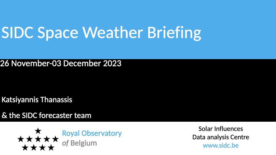 The Space Weather Briefing presented by the forecaster on duty from Nov 26 to Dec 3. It reflects in images and graphs what is written in the space weather report: https://www.stce.be/briefings/20231204_SWbriefing.pdf