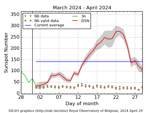 The daily Estimated International Sunspot Number (EISN, red curve with shaded error) derived by a simplified method from real-time data from the worldwide SILSO network. It extends the official Sunspot Number from the full processing of the preceding month (green line), a few days more than one solar rotation. The horizontal blue line shows the current monthly average. The yellow dots give the number of stations that provided valid data. Valid data are used to calculate the EISN. The triangle gives the number of stations providing data. When a triangle and a yellow dot coincide, it means that all the data is used to calculate the EISN of that day.