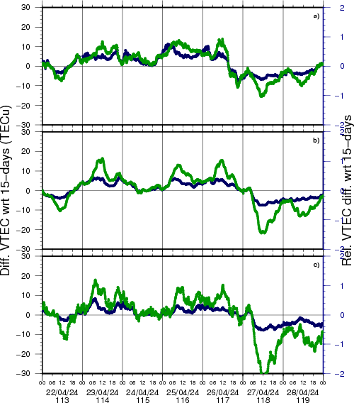 The time series below shows the VTEC difference (in green) and relative difference (in blue) with respect to the median of the last 15 days in the North, Mid (above Brussels) and South of Europe. It thus illustrates the VTEC deviation from normal quiet behaviour.