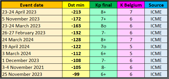 The table underneath provides the Top 10 of most significant geomagnetic events so far this solar cycle (SC25). It contains mostly events for which the Disturbance storm-time index (Dst - see the STCE Space Weather classification page at https://www.stce.be/educational/classification for more info) reaches -100 nT or less. The table contains the date of the storm, the Dst (provisional values; Kyoto WDC - https://wdc.kugi.kyoto-u.ac.jp/ ), the final Kp (from Potsdam GFZ - https://kp.gfz-potsdam.de/en/ ), and the K BEL index as recorded in Dourbes, Belgium (http://ionosphere.meteo.be/geomagnetism/K_BEL/ ). The last column gives the source of the disturbance, but in this case, all the geomagnetic storms had an interplanetary CME (ICME) as their source. It is expected that starting during the upcoming solar cycle maximum and subsequent declining phase of SC25, there's a good chance that the co-rotating interaction region preceding the high speed stream from a coronal hole (CH CIR; see this STCE newsitem at http://www.stce.be/news/269/welcome.html for more info on CIRs) will cause some noteworthy events that will stir intense geomagnetic storms (Dst lower than -100 nT). It is well-known that ICMEs can produce much stronger geomagnetic storms than CH wind streams and CH CIRs.