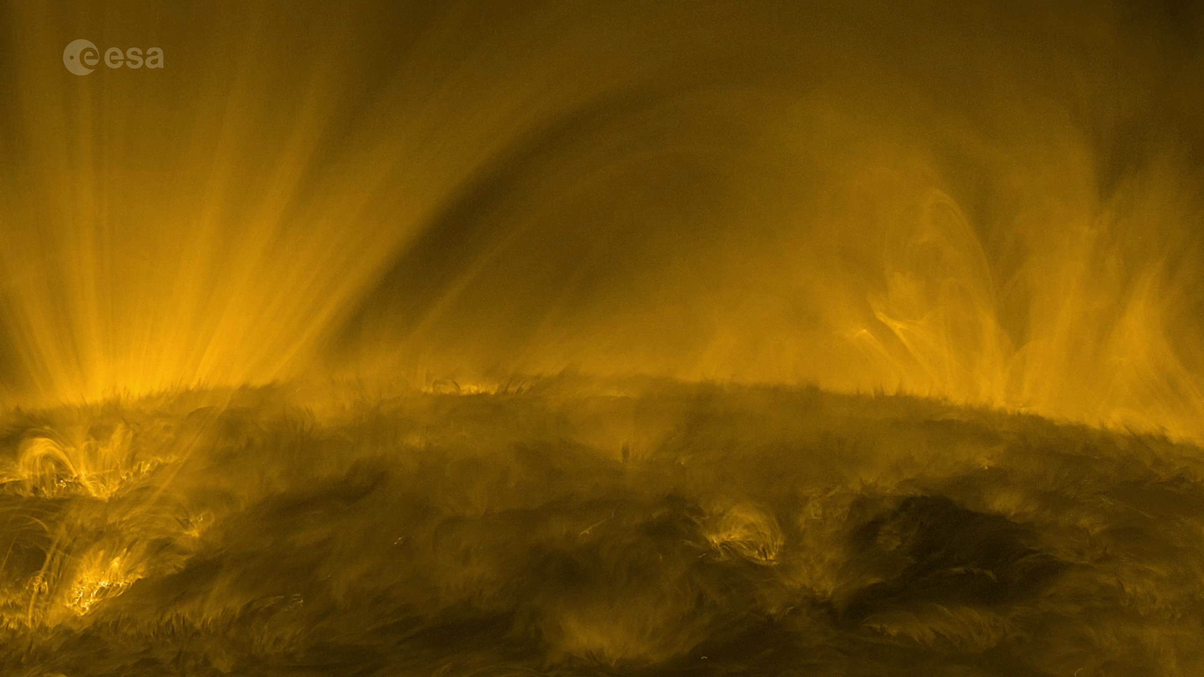 This otherworldly, ever-changing landscape is what the Sun looks like up close. ESA's Solar Orbiter filmed the transition from the Sun's lower atmosphere to the much hotter outer corona. The hair-like structures are made of charged gas (plasma), following magnetic field lines emerging from the Sun's interior.