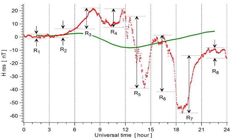 The Kp index (https://www.stce.be/educational/classification#geomag ) is one of the most popular parameters to measure planetary geomagnetic activity. It is derived from local K indices evaluated at 13 subauroral observatories from both northern and southern hemispheres (ISGI map - https://isgi.unistra.fr/indices_kp.php ). Each K index is derived for a specific observatory from the maximum fluctuations of the horizontal components observed on a magnetogram during a 3-hour interval, evaluated as the difference between the maximum positive and negative deviations (range "R") with respect to a reference curve, which essentially reflects the local diurnal variation at the observatory (see the illustration underneath - Stankov et al. 2010 - http://ionosphere.meteo.be/sites/ionosphere.meteo.be/files/documentation/publications/Team-Reports/STR-RMI-2010-01_K-LOGIC.pdf ). The local K index expresses geomagnetic activity on a scale of 0-9 at each observatory for a given 3-hourly interval of the UT day (00-03, 03-06, ... , 21-24 UT). K is designed to have a similar frequency distribution regardless of the observatory, and thus it does not depend on latitude (see e.g. Regi et al. 2020 https://gi.copernicus.org/articles/9/105/2020/ for an example). K indices are converted to standardized Ks indices, which take into account the influence of seasonal and UT biases. Kp is the average of the 13 Ks indices expressed in thirds (0o, 0+, 1-, 1o, 1+, 2-, ... , 9o), thus it represents planetary, rather than local, geomagnetic activity. The complete time series of the definitive Kp index exists since 1932 and is available from the Kp website at the Deutsches GeoForschungsZentrum GFZ Potsdam (https://kp.gfz-potsdam.de/en/ ). Kp is a historical parameter that is widely used in the space physics community, as it is known to be a good proxy of the solar wind energy input into the magnetosphere-ionosphere-thermosphere system.