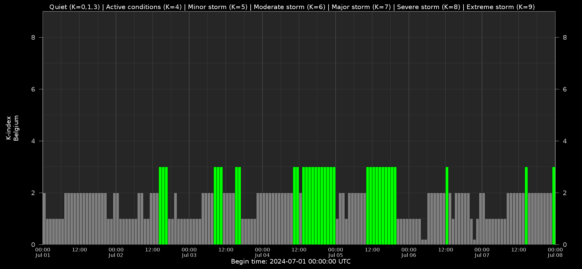 The geomagnetic conditions over the past week were quiet to unsettled, both globally and locally (Kp 1-3 and K Bel 1-3) with locally some active periods locally (K Bel 4) on June 30.