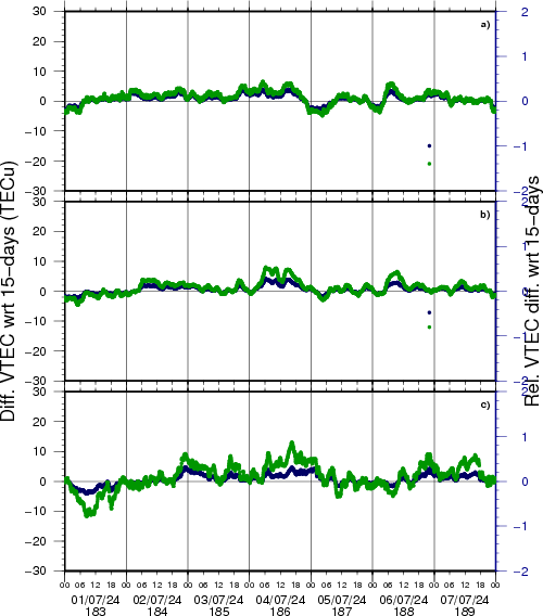 The time series below shows the VTEC difference (in green) and relative difference (in blue) with respect to the median of the last 15 days in the North, Mid (above Brussels) and South of Europe. It thus illustrates the VTEC deviation from normal quiet behaviour.