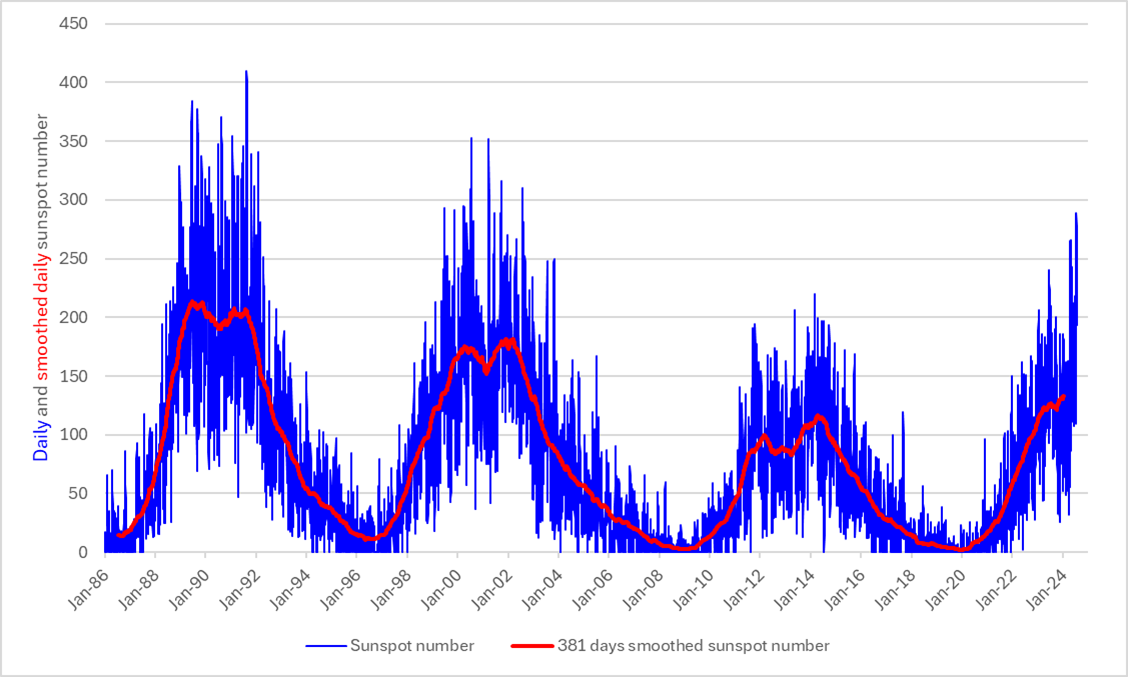 Last week's sunspot numbers were the highest so far during solar cycle 25 (SC25). The preliminary sunspot number reached values around 285 from 16 till 18 July. We have to go back to July 2002 to find higher values, when sunspot numbers varied between 290 and 310 (SILSO - https://www.sidc.be/SILSO/home ). The graph underneath shows the daily and smoothed daily sunspot number from 1986 (SC22) onwards. The 381 days smoothed value is simply the average value of 381 days of sunspot numbers, with 381 days corresponding to 14 solar rotations or about 12.5 months, showing the overall evolution of the solar cycle. Of note is the very low sunspot activity during the previous SC24, when sunspot numbers exceeded the 200-level on only a handful of days. The graph makes it also clear that sunspot numbers can reach much higher values, such as e.g. on 21 and 22 August 1991 when the sunspot number Sn was above 400. Since the start of the daily archiving by SILSO (1818 - present), the highest sunspot numbers recorded were in August 1870 (528 on the 26th) and in December 1957 (503 on 24-25th). In more than 200 years of near-continuous observations, only 5 days had a sunspot number in excess of 500. So far, the highest daily sunspot number during the 21st century was on 27 March 2001 (352).