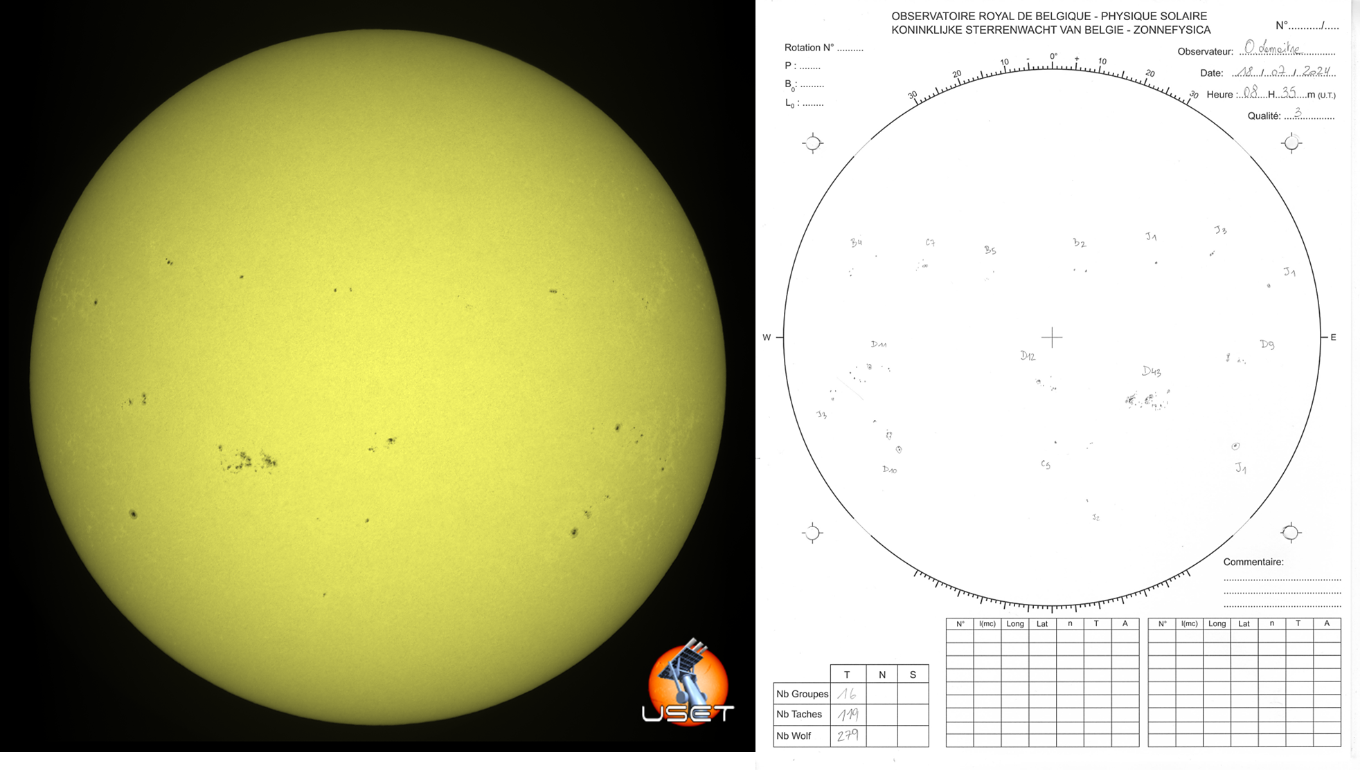 The mostly sunny weather in Belgium during July allowed the solar observers of the SIDC (https://www.sidc.be/ ) to monitor the Sun almost every day with their solar telescopes (USET , Uccle Solar Equatorial Table - https://www.sidc.be/uset/ ). Underneath are an image and a drawing (side reversed) made by the SIDC observers on 18 July, when the preliminary Sn was at its highest (289). The image and the drawing reveal 16 sunspot groups, and the observer penciled 119 dark spots, good for a total sunspot number of 279 (= 10x16 + 119). It's a coincidence that the USET sunspot number and the preliminary Sn correspond so well for this day, as Sn is of course an average of several observers (31 for that day) who use different telescopes and different observing methods rescaled to the reference observer (Sn version 2.0: https://www.sidc.be/SILSO/newdataset ).