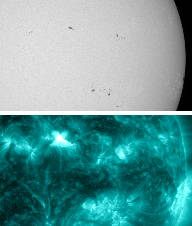 Nearly 2 dozen of M-class flares were produced during last week, mostly by the larger and more complex sunspot regions such as NOAA 3738 (4 M- and 1 X-class flare - https://www.stce.be/news/714/welcome.html) and 3751 (5). Despite the relatively small size of some of the sunspot groups, they were also contributing to the M-class flaring activity. The image (SDO - http://sdo.gsfc.nasa.gov/data/aiahmi/ ) underneath shows small active region NOAA 3744 in white light at the time (22:06UTC on 16 July) that an M1.9 flare took place in this region (extreme ultraviolet). NOAA 3744 and NOAA 3753 -another small region- produced 5 M-class flares each.
