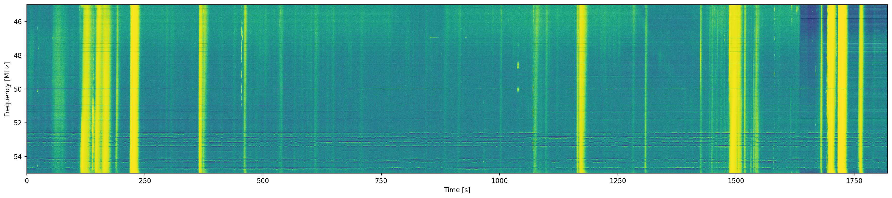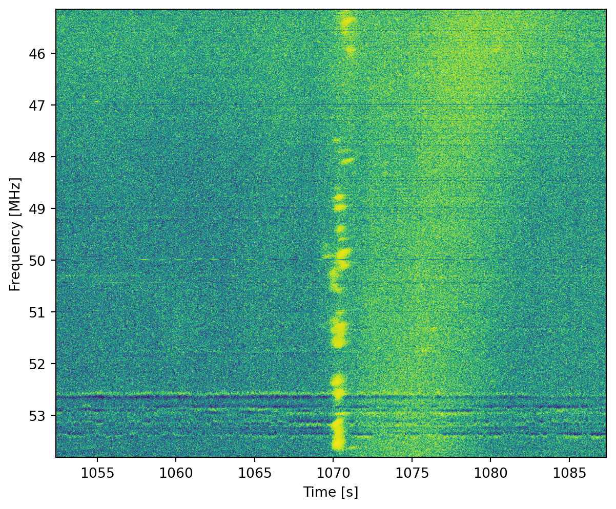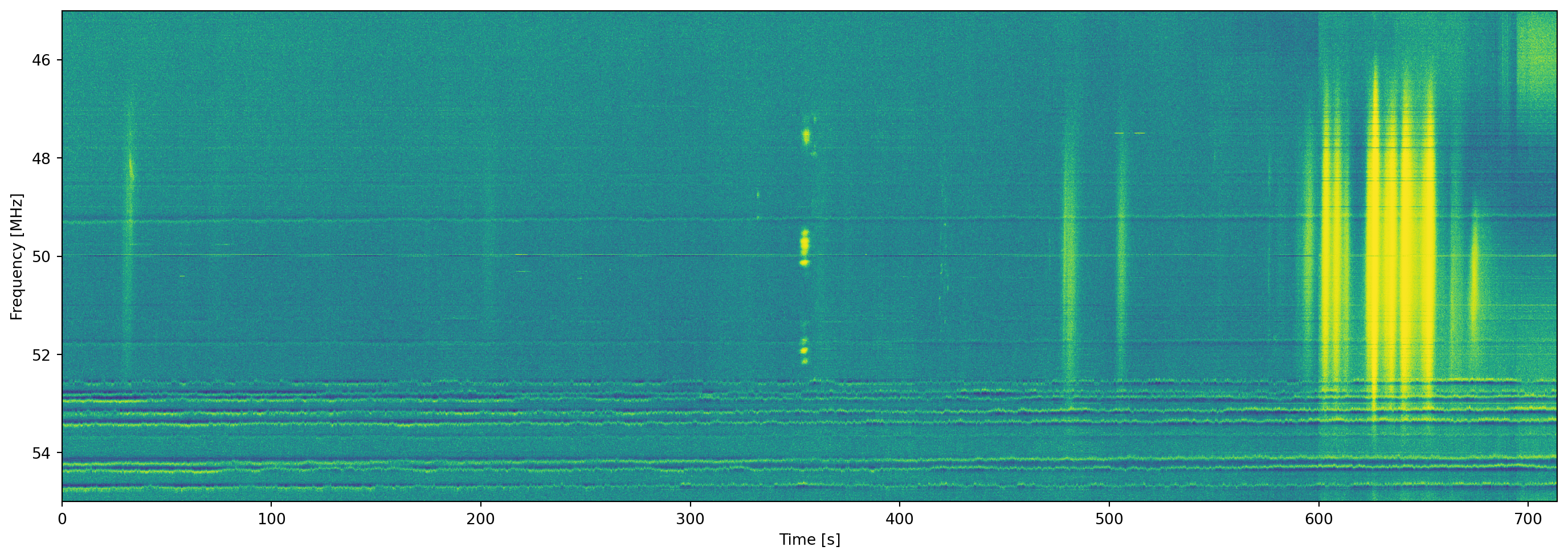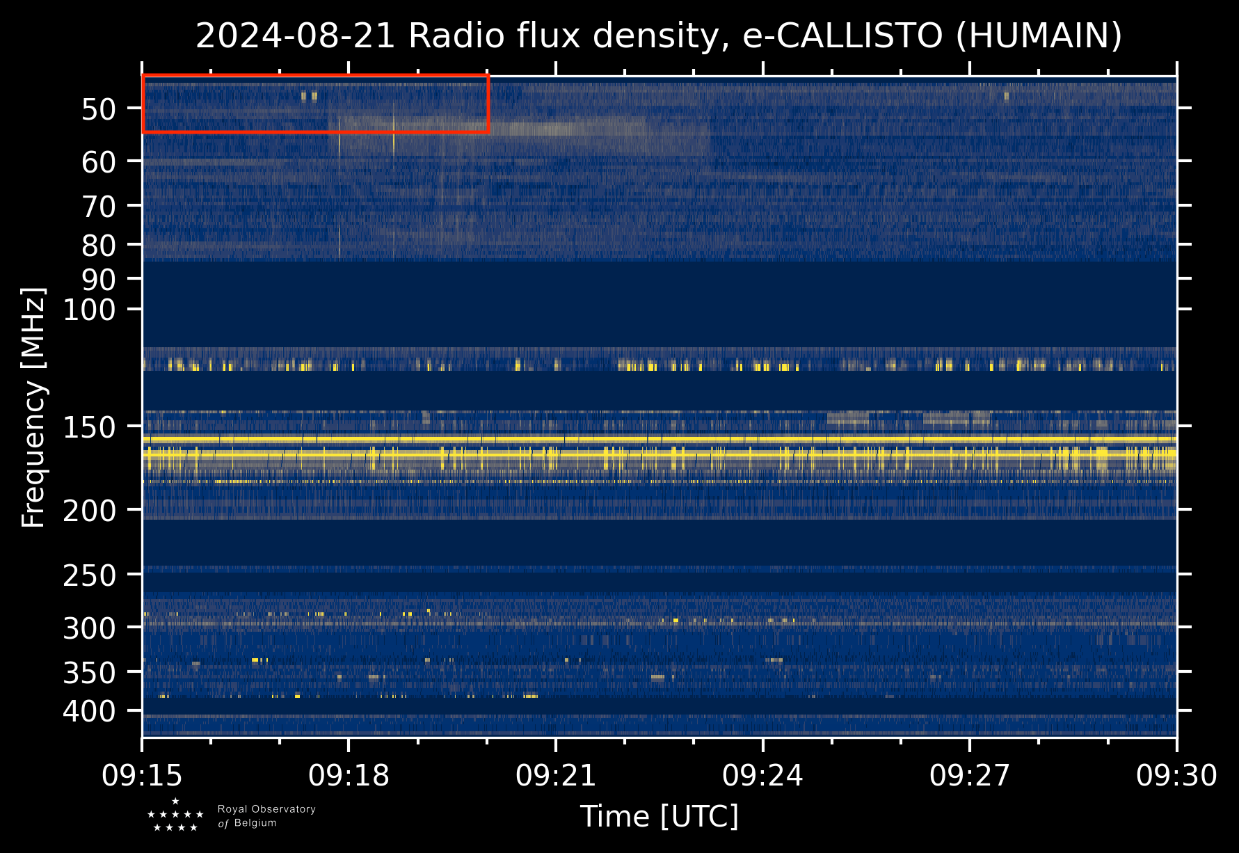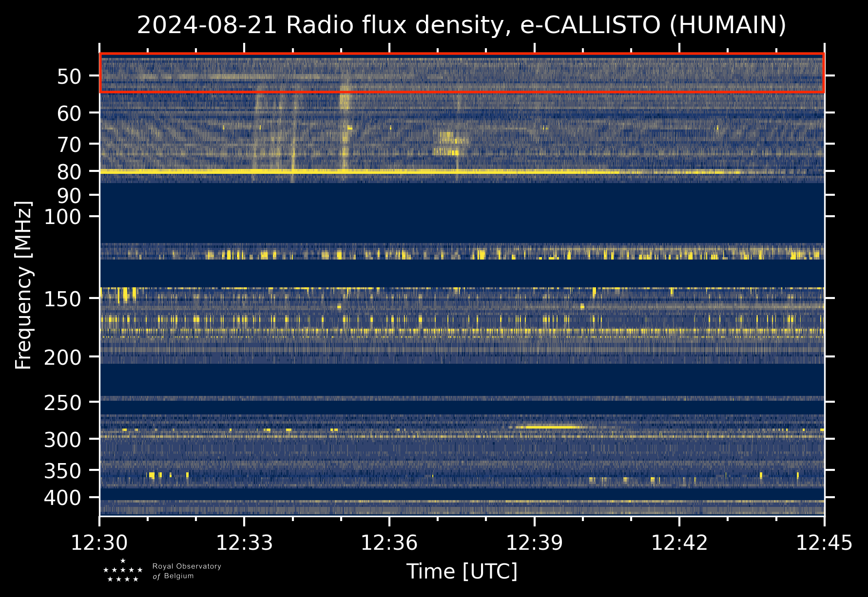After adding up the 8 channels, we make a spectrum and then observe for a while to make a dynamic spectrum such as the one below. This image shows almost 12 minutes of observations between 09:08 UT and 09:20 UT on August 21 2024. A CALLISTO spectrum from Humain is shown for comparison, with the corresponding frequency band highlighted in red. Note that the CALLISTO spectrum starts at 09:15 UT only. We see on the SPADE spectrum a group of type III bursts, barely visible on CALLISTO. This highlights the complementarity of these different instruments that are operating side by side in Humain.