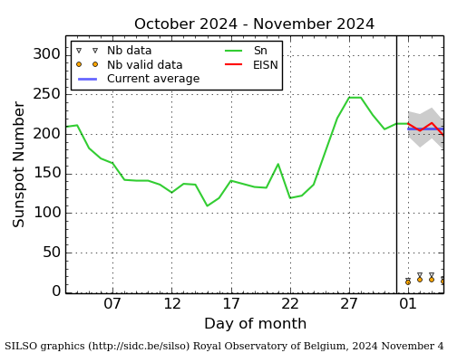 The daily Estimated International Sunspot Number (EISN, red curve with shaded error) derived by a simplified method from real-time data from the worldwide SILSO network. It extends the official Sunspot Number from the full processing of the preceding month (green line), a few days more than one solar rotation. The horizontal blue line shows the current monthly average. The yellow dots give the number of stations that provided valid data. Valid data are used to calculate the EISN. The triangle gives the number of stations providing data. When a triangle and a yellow dot coincide, it means that all the data is used to calculate the EISN of that day.
