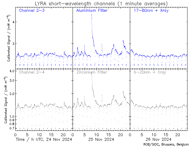 The largest flare of this week was an M9.4, and it was observed by LYRA (top panel) and SWAP (bottom panel). However, the increasing part was missed due to an occultation. The flare peaked on 2024-Nov-25 at 07:42 UT. It originated from an active region that was just behind the north-eastern limb, but the post-eruptive arcades can be seen for several hours after the event.