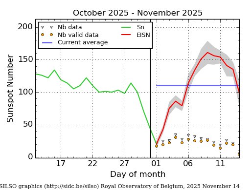 The daily Estimated International Sunspot Number (EISN, red curve with shaded error) derived by a simplified method from real-time data from the worldwide SILSO network. It extends the official Sunspot Number from the full processing of the preceding month (green line), a few days more than one solar rotation. The horizontal blue line shows the current monthly average. The yellow dots give the number of stations that provided valid data. Valid data are used to calculate the EISN. The triangle gives the number of stations providing data. When a triangle and a yellow dot coincide, it means that all the data is used to calculate the EISN of that day.
