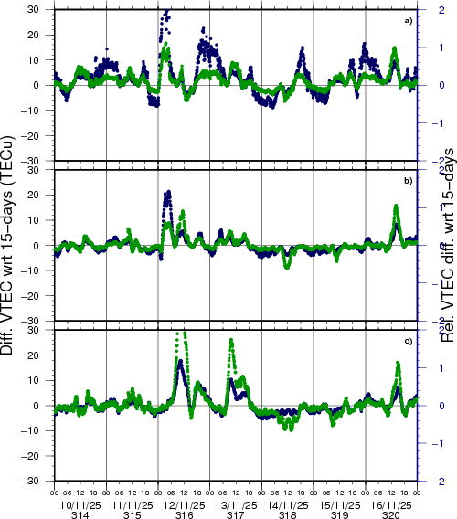 The time series below shows the VTEC difference (in green) and relative difference (in blue) with respect to the median of the last 15 days in the North, Mid (above Brussels) and South of Europe. It thus illustrates the VTEC deviation from normal quiet behaviour.