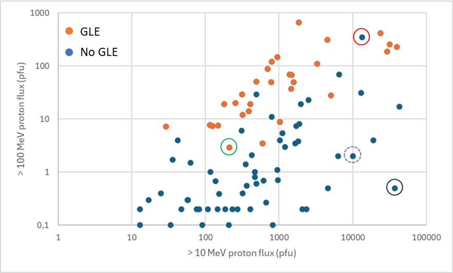 The plot underneath also shows some proton events with a very high P100, without resulting in a GLE. This is in part because a high P100 does not necessarily mean that there is also a sufficient number of high-energy particles (500 or more MeV) necessary to cause a GLE. This certainly explains a few proton events that have a P100 around 10 pfu but that eventually did not result in a GLE. Even then, there still remain some true anomalies. For example, during the 9 November 2000 event (red circled dot), the P100 reached a staggering 347 pfu. It was found that for this event, also the greater than 700 MeV proton flux was strongly enhanced. Yet, no GLE was observed! Another anomaly is the 6 May 1998 event (green circled orange dot), where no enhancement in the greater than 700 MeV proton flux was observed, yet the proton event still managed to produce a GLE. Studies such as by Thakur et al. (2016 - https://doi.org/10.1007/s11207-015-0830-9 ) have suggested that a series of factors such as the phase of the solar cycle, the height of the CME-shock formation, ... may all have combined into the materialization of these anomalies.