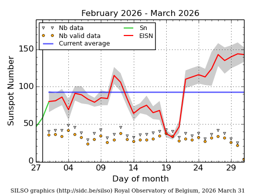 The daily Estimated International Sunspot Number (EISN, red curve with shaded error) derived by a simplified method from real-time data from the worldwide SILSO network. It extends the official Sunspot Number from the full processing of the preceding month (green line), a few days more than one solar rotation. The horizontal blue line shows the current monthly average. The yellow dots give the number of stations that provided valid data. Valid data are used to calculate the EISN. The triangle gives the number of stations providing data. When a triangle and a yellow dot coincide, it means that all the data is used to calculate the EISN of that day.