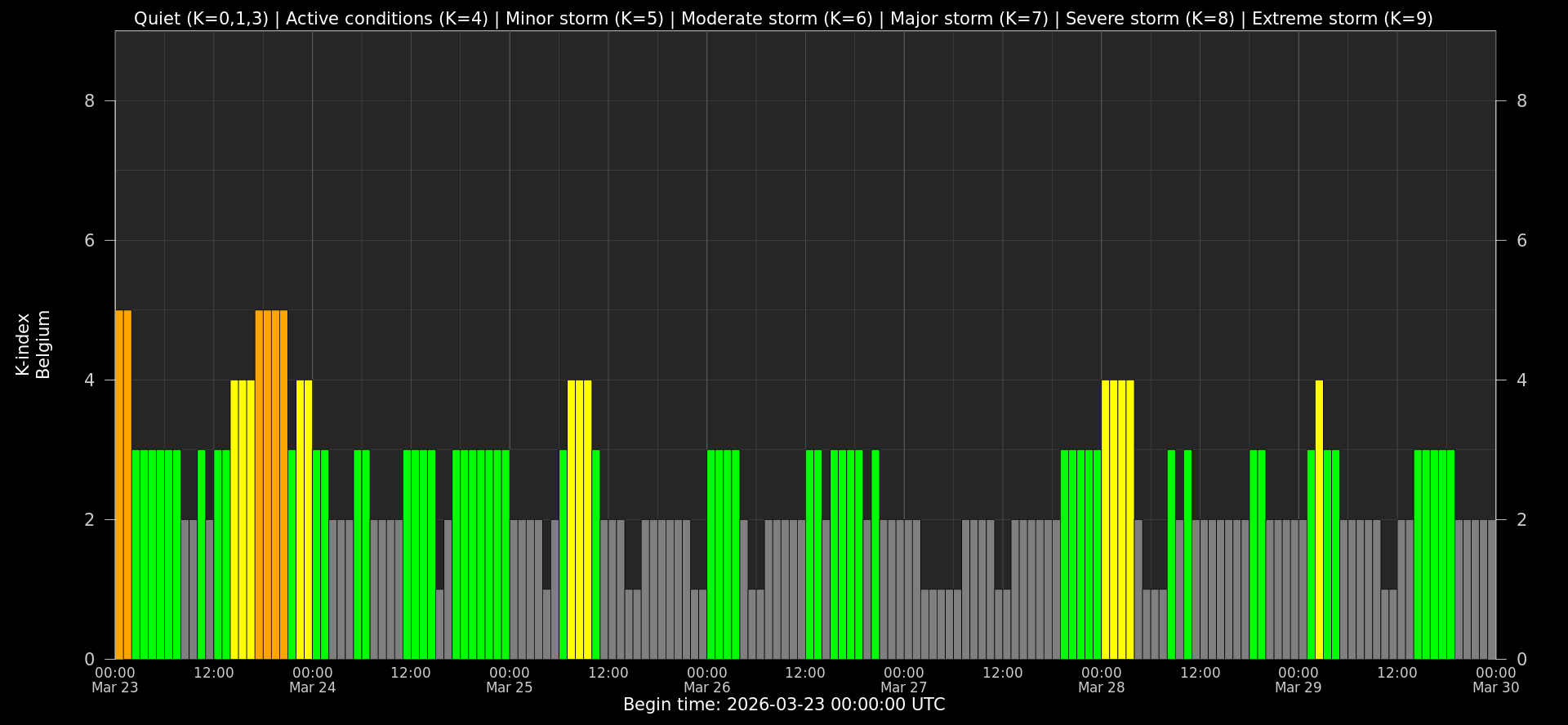 The local geomagnetic conditions registered a minor storm on 23 Mar (K BEL 5 at 15:00 - 21:00 UTC) and short intervals of active levels (K BEL 4) on 25, 28, and 29 Mar. The rest of the past week they ranged between quiet and unsettled levels (K BEL 1 to 3).