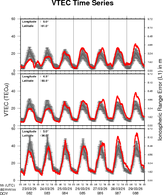 VTEC time series at 3 locations in Europe from 23 Mar 2026 till 29 Mar 2026