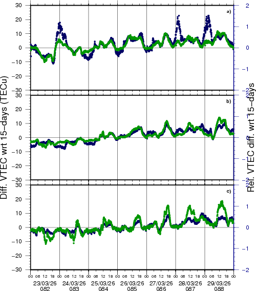 The time series below shows the VTEC difference (in green) and relative difference (in blue) with respect to the median of the last 15 days in the North, Mid (above Brussels) and South of Europe. It thus illustrates the VTEC deviation from normal quiet behaviour.