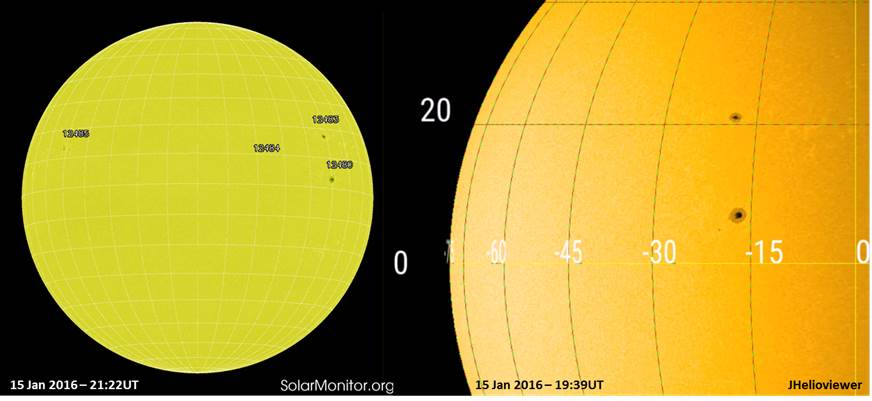 On 10 January, a small sunspot group appeared near the northeast limb at about 10 degrees in latitude and about 30 degrees to the west of two mature sunspot groups NOAA 2483 and NOAA 2480. This tiny region was numbered NOAA 2484 and, as small sunspot groups often do, it quickly faded out of view. The SDO/HMI images underneath show a full disk view of the Sun (left) and a zoom (right) late on 10 January resp. at 21:22UT and 20:39UT, and again on 15 January around 20:00UT. NOAA 2484 consists really only of those two puny dots 45 to 60 degrees to the west of the central meridian (top images), whereas it is spotless on the bottom images.