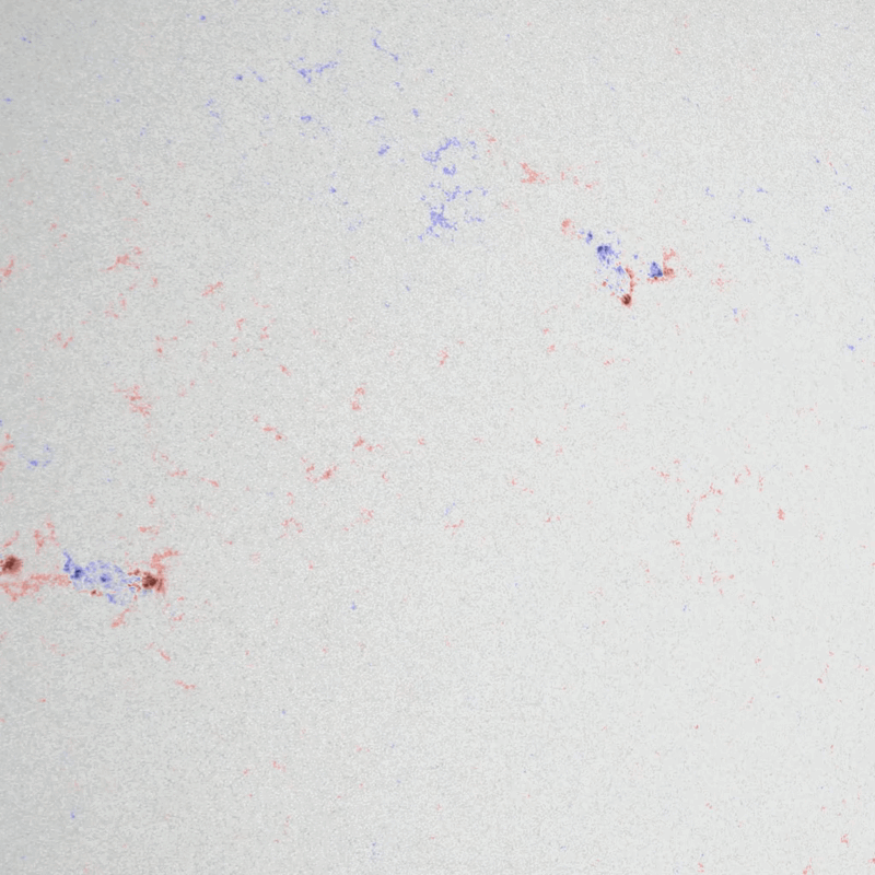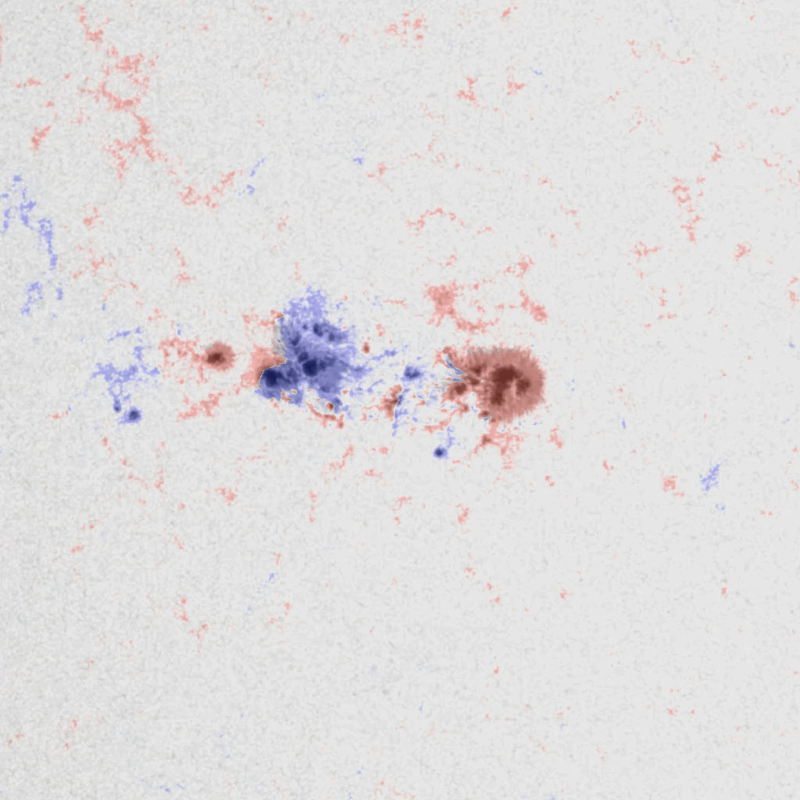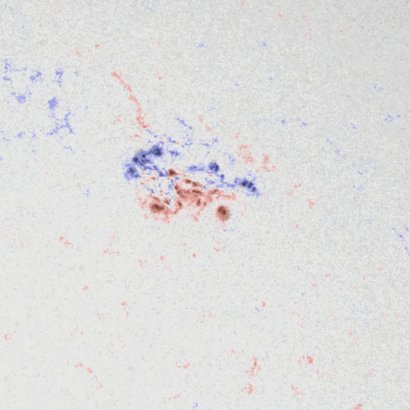 NOAA 4246 (SIDC active region 639) started to develop on 10 October into a large and complex active region. According to the SIDC space weather (SWx) forecaster (sunspot chain), this sunspot region reached the most complex classification both in white light (McIntosh ; Fkc) as in magnetograms (Mount Wilson ; Beta-Gamma-Delta). Both classifications are explained on the STCE SWx Classification page. The annotated SDO images underneath show the evolution of NOAA 4246, i.e. the sunspot group in the upper right corner, in white light (left) and in magnetograms (right) with red indicating the positive polarity (magnetic field lines coming out of the solar surface) and blue the negative polarity (magnetic field lines returning into the solar surface). The image on the right actually has the magnetogram overlaid on the white light image, to highlight the correspondence between sunspots and their magnetic polarity. The clips cover the period from 11 till 15 October at a cadence of 1 image per hour (annotated still from 15 October at 04:00UTC). For the 13-15 October period, there are are also zooms available for both NOAA 4246 and 4248.